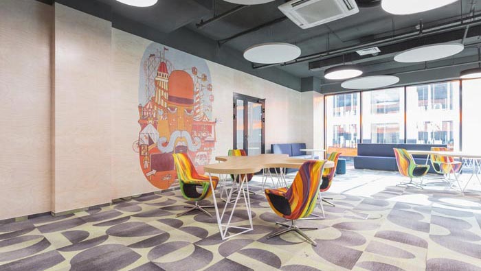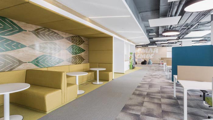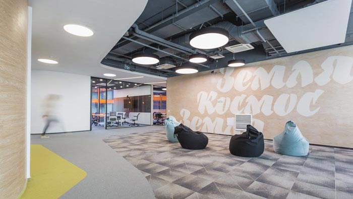 過道結(jié)合部的設(shè)計:此處為整個企業(yè)的內(nèi)部交匯點,在此處過道呈四面八方式分布,不管走哪一個方向都可以繞回原地,這也是一個大回型動線設(shè)計,故此設(shè)計師在設(shè)計中在此地開辟出一片如凈土般的區(qū)域,以軟裝進行鋪墊,讓員工、客戶在此處可以休息、娛樂,可增可減的沙包型座椅,也在無形中成為一處亮點。