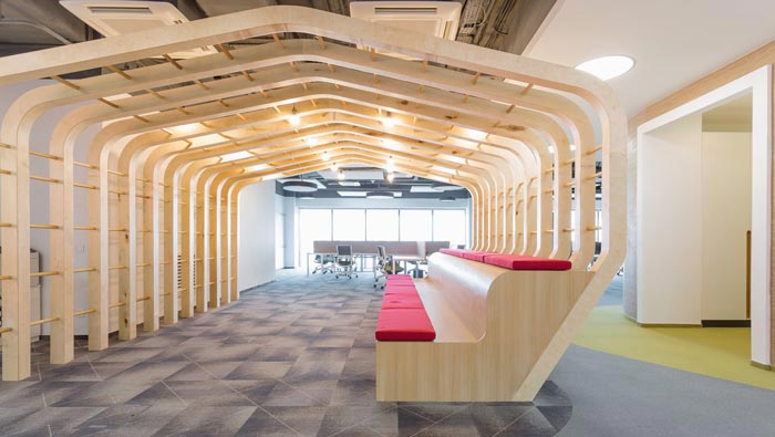 休息區(qū)域的設(shè)計:設(shè)計師在設(shè)計的時候,采用了三位一體的設(shè)計手法,融合了過道、造型與休息區(qū)域,將一個過道空間改為空間的一處亮點,上下兩層休息區(qū)域增加了容納能力,也增加了空間的流線造型,設(shè)計師希望為企業(yè)的每一處空間都留下一處讓人眼前一亮的設(shè)計。