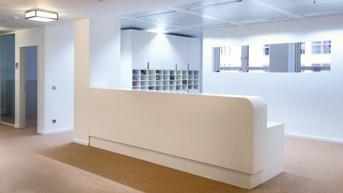 前臺(tái)的設(shè)計(jì):對(duì)于醫(yī)療行業(yè)來(lái)說(shuō),大家最熟悉的莫過(guò)于白衣天使,設(shè)計(jì)師在此次設(shè)計(jì)中,也采用了白色做為空間的主元素,目的就是讓顧客進(jìn)入空間之后,可以一眼就看出企業(yè)的屬性,同時(shí)白色也有讓人心情愉悅的屬性,陽(yáng)光照入室內(nèi)為空間增添了些許魅力。