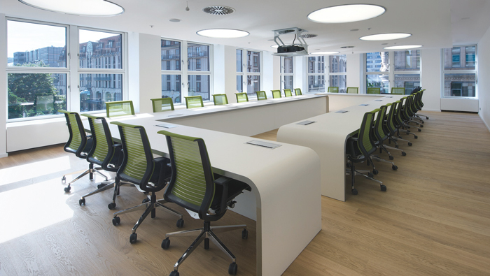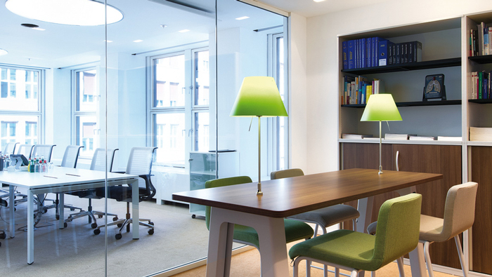 會(huì)議室的設(shè)計(jì):此處可以容納將近30個(gè)人,在這里開放是空間的主旋律,在這里員工感受到的是一種輕快之感,這也是設(shè)計(jì)師希望看到的,在設(shè)計(jì)師看來(lái)一個(gè)輕快的會(huì)議空間,可以在無(wú)形中化解對(duì)于員工的壓力,讓員工可以在這里的空間中得以自由發(fā)揮。