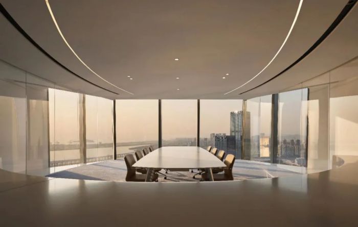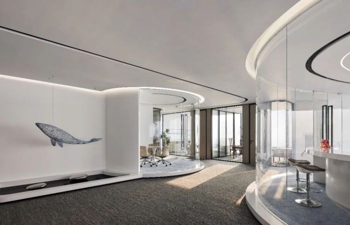 空間中充滿海洋文化的氣息,懸吊的鯨魚藝術(shù)裝置成為空間的導(dǎo)言,歡迎人們深入其中。員工區(qū)呈現(xiàn)開放交流的狀態(tài),便于員工間的密切合作。整體的空間型態(tài),如展翅的鯤鵬翱翔于大海之畔。