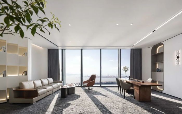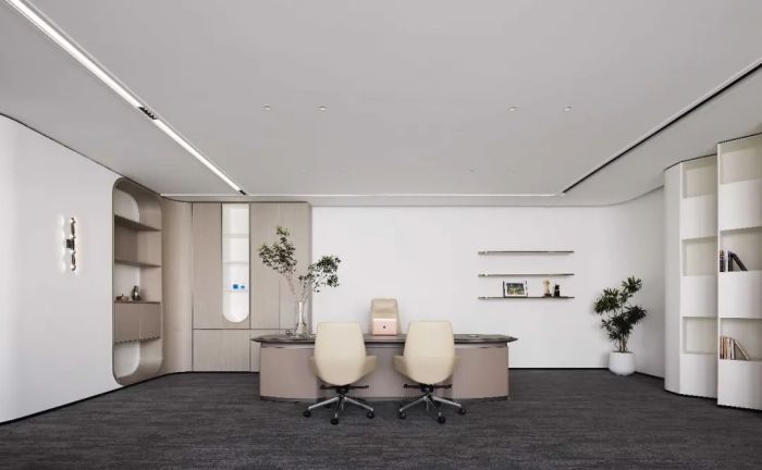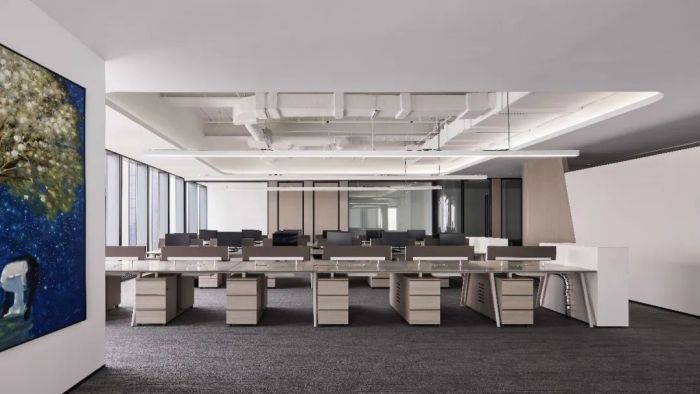 這是一個(gè)金融行業(yè)公司的辦公室,有1100方的面積。設(shè)計(jì)目的是營造舒適健康的金融商務(wù)空間,并體現(xiàn)一種帶有大地藝術(shù)氣質(zhì)的室內(nèi)美學(xué)。設(shè)計(jì)風(fēng)格采用大而平順的弧度和圓潤的造型,注入了柔性力量。
