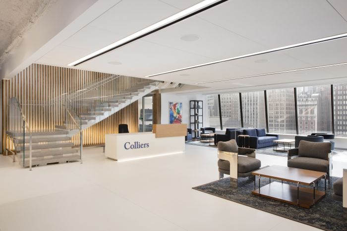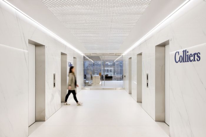 這是一個(gè)5500方的辦公室,整體空間寬敞明亮。整個(gè)空間設(shè)計(jì)都凸出體現(xiàn)了公司的品牌,同時(shí)還采用了極簡(jiǎn)主義的色調(diào)和紋理。大理石面板從電梯大廳一直延伸到白色、淺灰色和藍(lán)色的輕盈背景中。