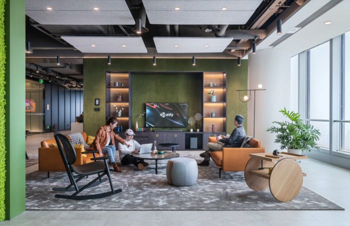 這是一個外企科技公司的辦公室空間,面積為3600平,該辦公室的設計注重將本地特色與全球標準的辦公環(huán)境相結合,旨在為創(chuàng)作者、合作伙伴和客戶提供一個共同創(chuàng)新和交流的平臺。設計師運用創(chuàng)意和真實的材料,致敬 Unity 的價值觀,即賦予所有創(chuàng)作者力量,實現(xiàn)他們的創(chuàng)意。
