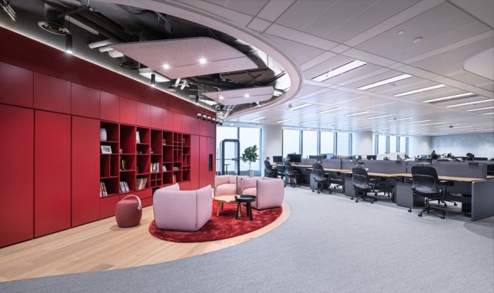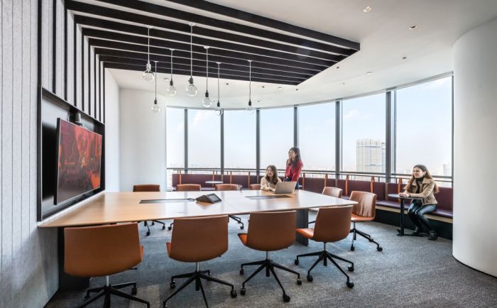 辦公室采用多種類型和形式的燈光,包括地面、吊燈和桌面燈光,以呈現(xiàn)明亮、充滿活力的工作文化。辦公室還運用了中國傳統(tǒng)文化元素,如靈感來源于中國古代故事的地面和家具設計,以及以中國農(nóng)歷年為靈感的室內裝飾。 辦公室還強調了與本地社區(qū)的聯(lián)系,通過標志、裝飾和環(huán)境藝術作品等方式運用了中國傳統(tǒng)文化的符號、顏色和字體。此外,辦公室還注重環(huán)境友好和員工福利,包括提供全景視野的餐廳和社交區(qū)域,以及可調節(jié)高度的辦公桌。