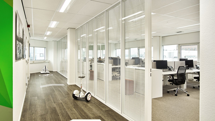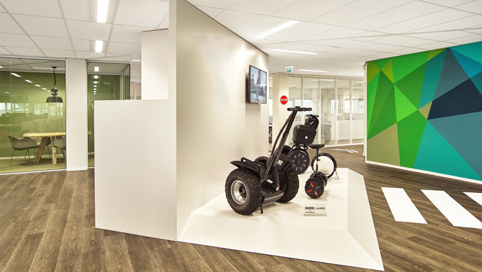 走廊的設計:代步車在這里馳騁,設計師的想法就是讓員工與客戶都能親自感受,因為產品本身就是讓人用的,但往往很多企業(yè)的產品內部員工都是無福消受的,設計師認為這是不對的,因為只有員工親自感受過之后,才能提出自己的想法與看法,在使用的過程中優(yōu)化他們、改進他們。