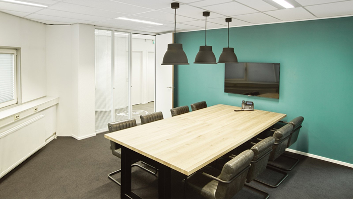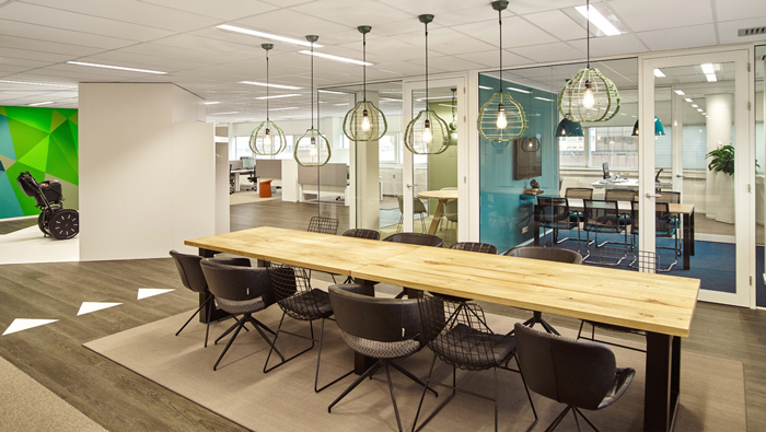 會議室的設計:相信大家看到很多會議室都是封閉式的,此處設計師提出了一個新的想法,就是打造一處開放式的會議室,但開放式不是說設計就設計的,而是要觀察四周的格局是否能夠完成,最后發(fā)現此處剛好處于菱形空間的中心區(qū)域,其他區(qū)域對此處的影響微乎其微。