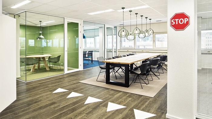 動線的設計:通過地上的標志大家有沒有想到什么,對的你沒有想錯,就是交通圖標,這是設計師受到交通圖標的啟發(fā),認為空間的動線不僅要滿足人走也要滿足代步車走,這樣交通圖標就不可缺少,讓彼此各行其道,紅色的STOP提示著此處不通、請繞行,避免了對辦公區(qū)域的影響。