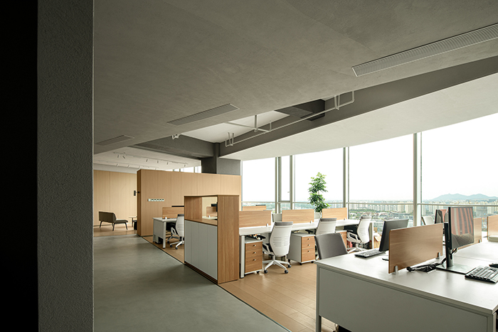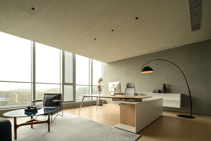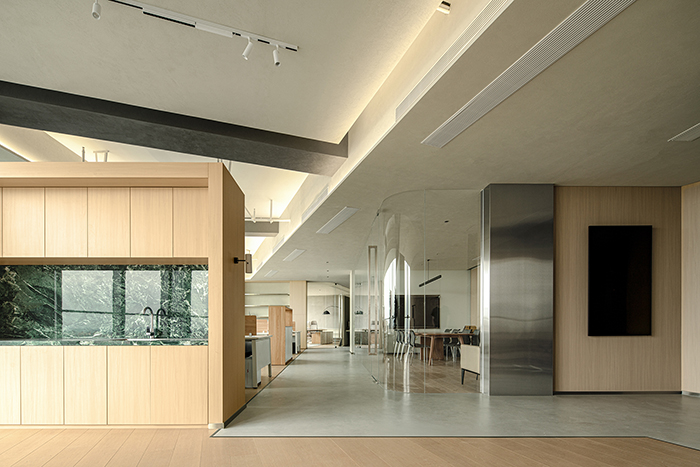 企業(yè)產(chǎn)品專注可持續(xù)性人工種植,主設計師對此表達為生態(tài)的感觀,提煉企業(yè)產(chǎn)品紗線最源頭的木材做為空間木飾面,同時希望在水泥墻面的深淺交錯的映襯。