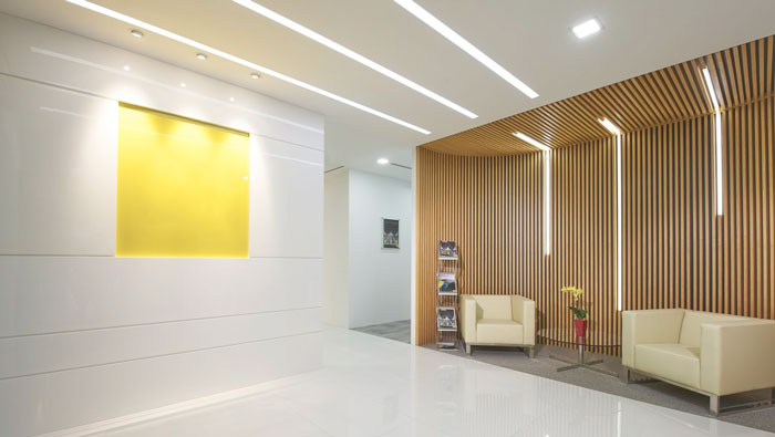 進(jìn)門區(qū)域的設(shè)計:設(shè)計師在設(shè)計的時候,考慮到金融辦公室裝修的特性,并考慮到辦公現(xiàn)場的現(xiàn)狀,故此采用去前臺的設(shè)計手法,并在空間的斜對面加入了接待區(qū)域,這樣做的目的就是為了協(xié)調(diào)與前臺之間的關(guān)系,當(dāng)客戶進(jìn)入空間之后,整個空間呈夾角分布,指明了進(jìn)入空間的路徑。