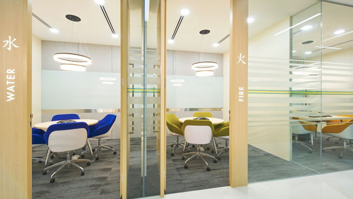 接待區(qū)域的設(shè)計:因為企業(yè)業(yè)務(wù)的私密性較強(qiáng),故此對于接待區(qū)域的私密性就有很高的要求,每一個接待區(qū)域都是由隔音玻璃組成,這樣是為了打造絕對安靜、隔音的空間,同時設(shè)計師以水、火、木、金、土對5個接待區(qū)域進(jìn)行命名,這樣的命名即好記也有循環(huán)往復(fù)的含義。