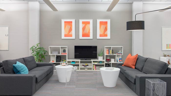 休息區(qū)域的設(shè)計:此處的設(shè)計,設(shè)計師參考了家庭客房的設(shè)計,設(shè)計師希望讓員工在休息之余,可以有事情可做,在這里可以看看電視,互相追追劇,讓員工的休閑時間更加多姿多彩,讓員工在此處感受到家的氛圍,這樣更能促進創(chuàng)意的產(chǎn)生,同時此處也可以做為交流區(qū)域,促進企業(yè)與客戶之間的距離。