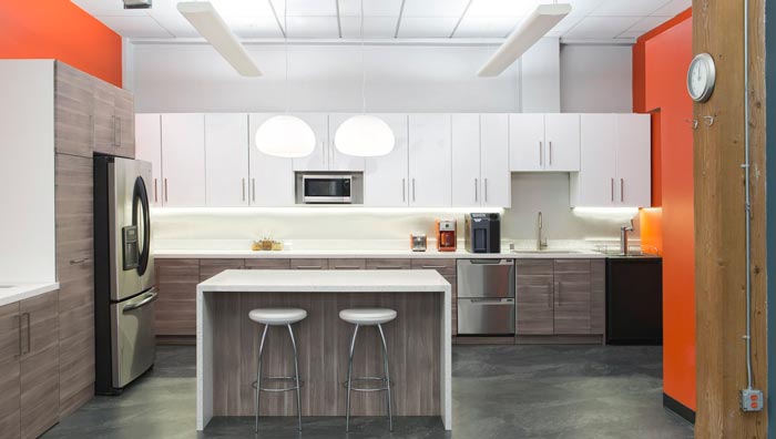 茶水間的設(shè)計:此處設(shè)計師以廚房為原型做為設(shè)計參考,目的就是將空間打造成一個集辦公與家庭相結(jié)合的空間,讓員工在辦公的同時無時無刻都感受到家的溫馨,這樣對于企業(yè)的發(fā)展有很好的促進作用,設(shè)計師希望讓關(guān)心、溫暖成功企業(yè)的代名詞,讓關(guān)心、溫暖成為企業(yè)發(fā)展產(chǎn)品的動力與原則。