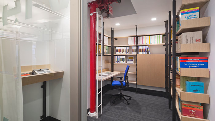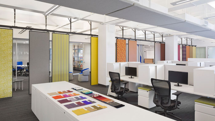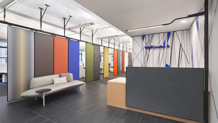 前臺的設(shè)計(jì):前臺與辦公區(qū)域位于空間的左右兩側(cè),設(shè)計(jì)師在辦公室設(shè)計(jì)中,將隔斷打造成布匹的模樣懸掛在空間的中心區(qū)域,這樣一來客戶進(jìn)門后看到的就是一段段懸掛著的布匹,在顯示企業(yè)屬性的同時(shí),也起到空間阻隔的作用,前臺縱橫加錯(cuò)的絲線仿佛是織布的線條,這無不在顯示企業(yè)的屬性。