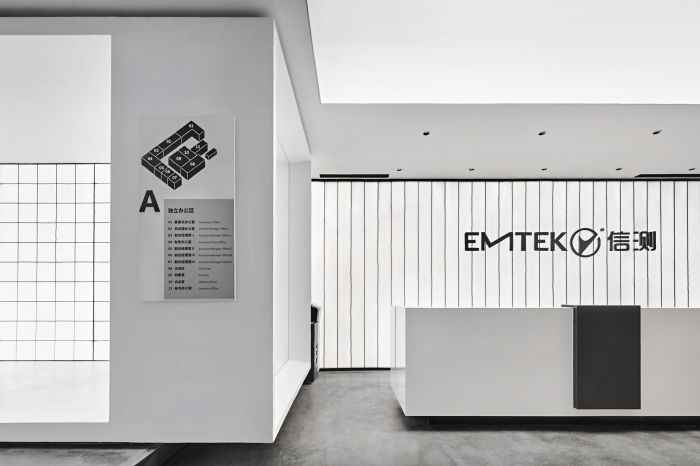 這是一個(gè)檢測(cè)科技公司辦公室的設(shè)計(jì),有1000方的面積。設(shè)計(jì)師在重新設(shè)計(jì)品牌空間時(shí),通過延續(xù)黑白灰的基調(diào),加入對(duì)立、沖突的元素,消解空間軸線的刻意規(guī)律感。