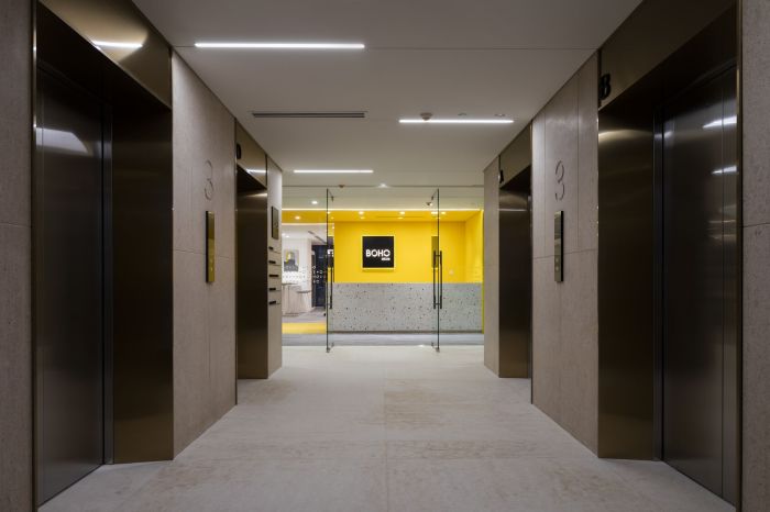 設(shè)計師將公共空間如接待處、服務(wù)臺、大廳廊道和文印室統(tǒng)統(tǒng)歸攏到一個稱為“核心”的中央空間。工作區(qū)圍繞這處核心空間展開,引導(dǎo)人們的視線都集中朝向核心區(qū)。這種向心點的設(shè)計手法目的是體現(xiàn)公司的協(xié)作京生。