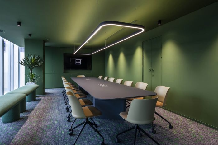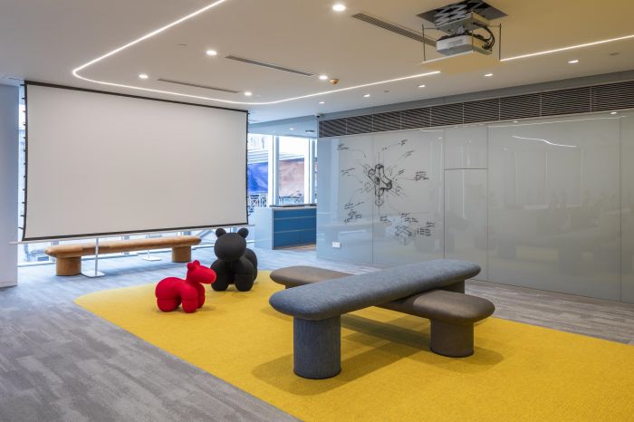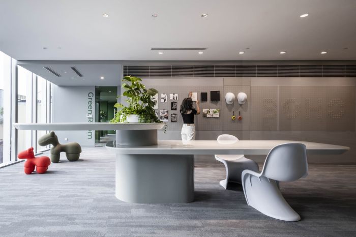 他們試圖打造一個能展現(xiàn)企業(yè)文化并能激發(fā)團隊熱情的辦公場所。所以空間減少了實體隔墻,以展現(xiàn)開放的辦公文化。運用塊面色彩、幾何形式、通透的玻璃隔墻去界定各功能區(qū)域,形成沒有視覺阻隔的開敞空間感。這樣的設(shè)計也正好契合公司致力于互動與協(xié)作的工作精神。