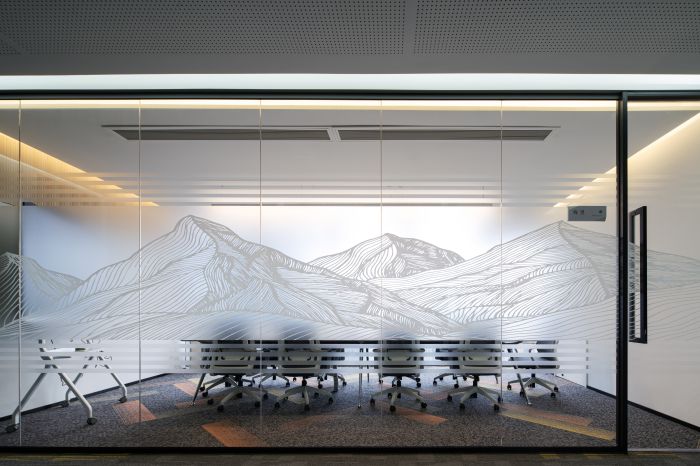 空間的一角設置有員工休息區(qū),員工可以在這個空間里休息和討論,桌椅的不同組合讓這個空間也可以作為大型培訓的場所。空間內(nèi)有一個橙色的V字,是對空間原有建筑的延續(xù),使得整個空間靈動。