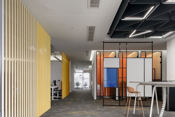 前臺空間使用了白色大理石材質(zhì),整體風格簡潔優(yōu)雅??臻g右側使用企業(yè)的品牌色黃色和橙色設置了一個線條隔斷,用于分隔入口區(qū)域和辦公區(qū),保護企業(yè)辦公空間的隱私。空間讓來訪者感覺流暢現(xiàn)代,同時也充滿了企業(yè)的個性。