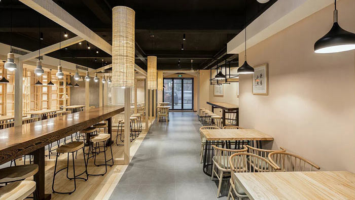 特色面館設(shè)計(jì):整個(gè)空間由原木裝飾構(gòu)造而成,原木材質(zhì)粗糙且質(zhì)樸,細(xì)膩且精致,整個(gè)空間自成一脈,表現(xiàn)了面館精益求精的匠人精神。