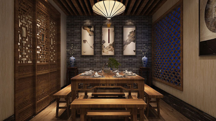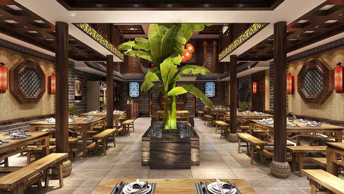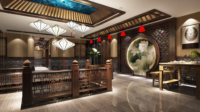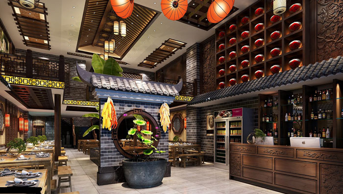 中式川菜館大廳裝修設(shè)計(jì):大廳給人的感覺好似回到過去,但是又稍有不同,設(shè)計(jì)師在中式設(shè)計(jì)的同時(shí),也加入了很多現(xiàn)代元素,目的就是希望營造一個(gè)古代、現(xiàn)代融合的空間。