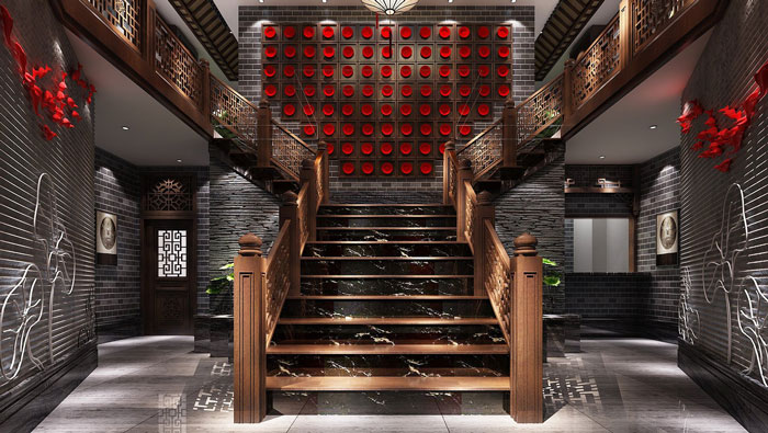 中式川菜館樓梯裝修設(shè)計(jì):一分為二的木制樓梯,相信現(xiàn)在很少見到,這樣的樓梯一來是為了更好的分流,二來是起到連接空間的作用,客戶在這里感受到濃郁的古式風(fēng)格。