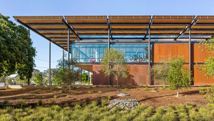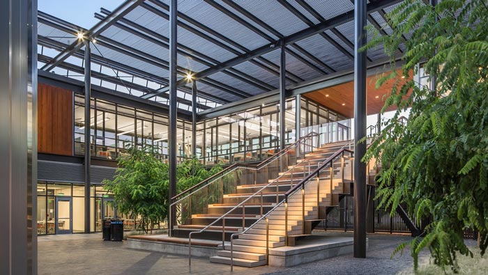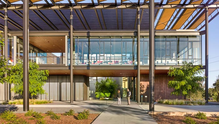 辦公樓進(jìn)門區(qū)域的設(shè)計(jì):頂部折疊的設(shè)計(jì),可以將強(qiáng)光擋在遮光板之外,讓光經(jīng)過阻擋后變?yōu)槿峁猓@樣的轉(zhuǎn)換讓人可以免受強(qiáng)光的照射,同時(shí)遮光板也有吸收太陽能的作用,經(jīng)過專業(yè)設(shè)備的轉(zhuǎn)換,為日常照明、工作提供了免費(fèi)的電源,設(shè)計(jì)與設(shè)計(jì)之間環(huán)環(huán)相扣,讓廠房自身的節(jié)能趨于完美。
