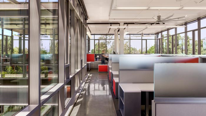 辦公區(qū)域的設(shè)計(jì):通過上圖可以看出此處空間,是一個(gè)半開放、半封閉的辦公空間,設(shè)計(jì)師這樣設(shè)計(jì)的目的就是希望,給每一個(gè)員工留下足夠的私人空間,辦公區(qū)域四周都是透明窗戶,這樣可以保證陽光可以時(shí)時(shí)照入室內(nèi),墻沿處設(shè)計(jì)師采用了進(jìn)門的折疊遮光板,將強(qiáng)光變?yōu)槿峁饨o每一個(gè)人溫暖的感受。