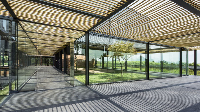 紅糖廠房外部進門區(qū)裝修設(shè)計:這里是連接進門處、和外部的區(qū)域,連廊的設(shè)計即可以抵擋陽光,同時又保證了空間的通透,木材都是做過防水處理的,這樣可以保證內(nèi)部綠植的生長。