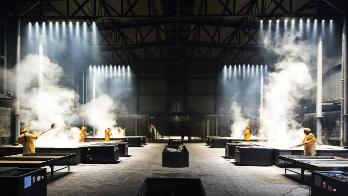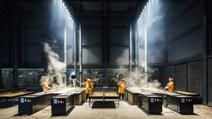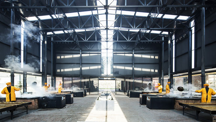 紅糖廠房車間細節(jié)裝修設(shè)計:這里強調(diào)的是對煙霧的處理,看似垂直向上的煙霧,實則也是設(shè)計師經(jīng)過多次研究的結(jié)果,設(shè)計師考慮到煙霧對工作人員的影響,故此重點解決。