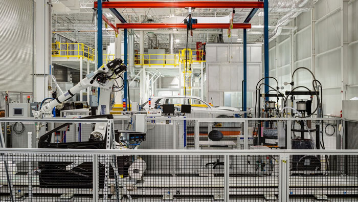 汽車工廠車間裝修設(shè)計:這里是機器人給汽車原型,進(jìn)行上裝的地方,機器人搭配先進(jìn)的涂料系統(tǒng),將各種涂料按照原本的計劃,一步不差的涂抹在車身,車輛上裝在這里完成。