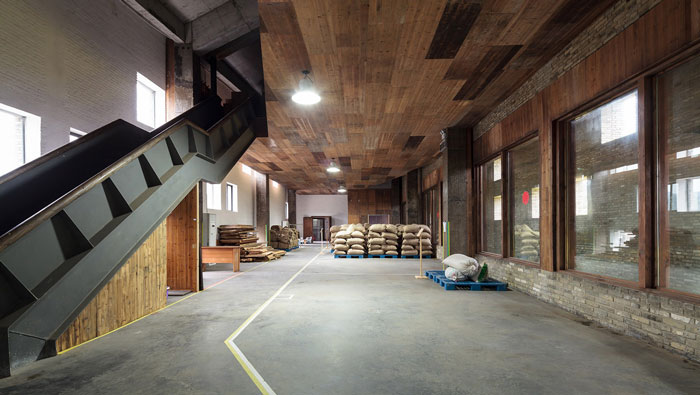 廠房入口裝修設(shè)計(jì):斜坡式的建筑增強(qiáng)了建筑的排水能力,同時(shí)與周圍的山勢(shì)相互融合,讓建筑與自然融為一體,門、窗的設(shè)計(jì),也可以看出室內(nèi)設(shè)計(jì)師,也持同樣的態(tài)度。