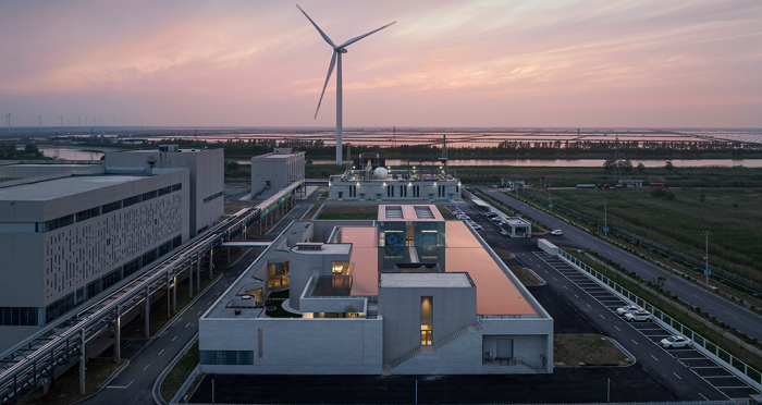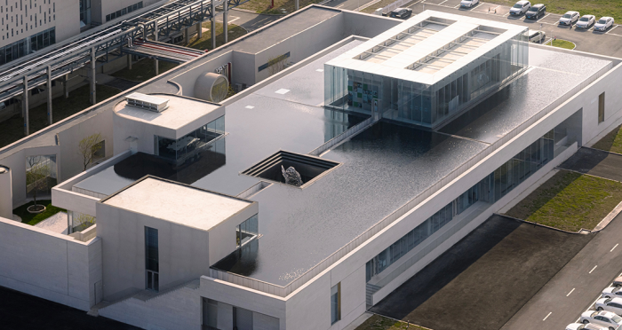 這是一個(gè)新能源材料行業(yè)的工業(yè)廠區(qū)的設(shè)計(jì)案例。廠區(qū)建筑以水為主題,水上的漣漪仿佛叩響生命與物質(zhì)的存在邊界。生產(chǎn)車(chē)間的發(fā)酵恒溫水排走之前,在辦公區(qū)屋頂匯成淺池。