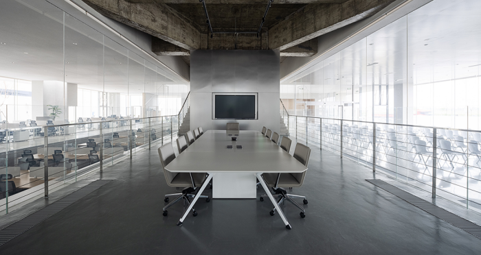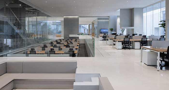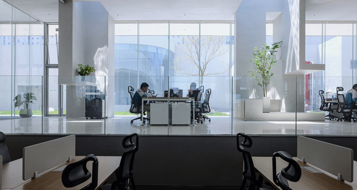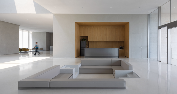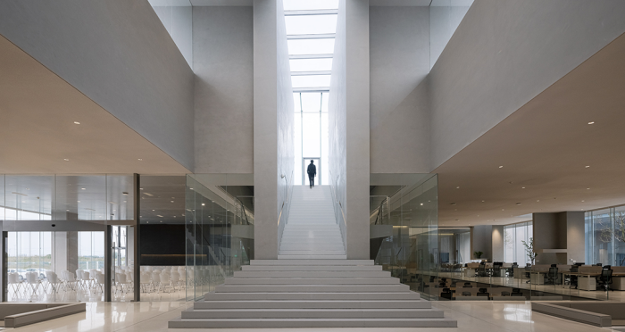 展廳、會(huì)客廳和行政會(huì)議室凸出水面,辦公區(qū)、會(huì)議室、員工食堂、廚房和多功能廳等大部分空間沉在水面以下,墻柱等構(gòu)筑物和房間像細(xì)胞器一樣自由分布,具有極好的漫射采光。