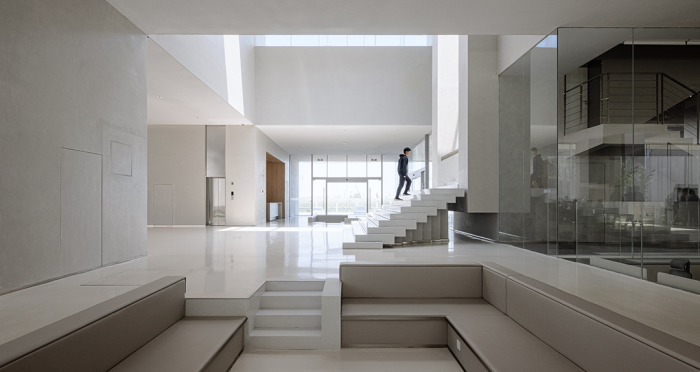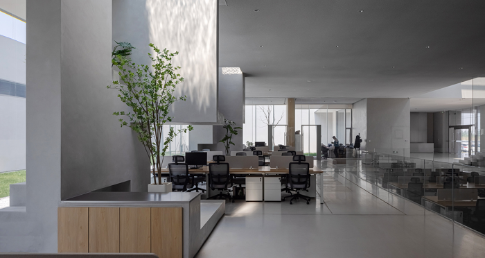 建筑被抬高1.2米,在庭院中額外覆土,可以盡快種植樹(shù)木。溫度控制則采用工廠車(chē)間恒溫水循環(huán),設(shè)置地出風(fēng),充分利用地面樓板下的空腔,釋放天花高度。