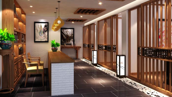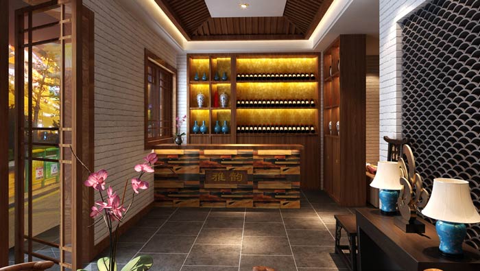 中式茶餐廳引導(dǎo)區(qū)設(shè)計:此處正對包廂,讓無微不至的服務(wù)體現(xiàn)在每一個細節(jié)當(dāng)中,之所以在這里安置吧臺,是避免出現(xiàn)服務(wù)死角,設(shè)計師希望讓客戶體會到無微不至的服務(wù)。