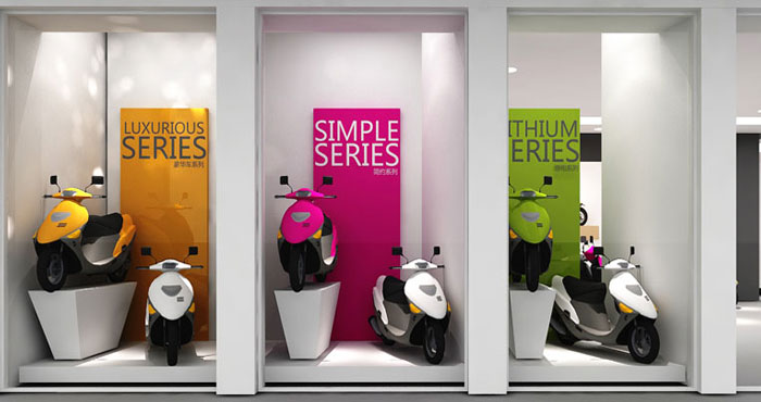 設(shè)計(jì)理念:設(shè)計(jì)師在設(shè)計(jì)之初,首先考慮到就是顧客見到店面的第一感覺。因?yàn)轭櫩瓦M(jìn)到店面之后第一眼看到的就是電動(dòng)車烤漆的顏色,這樣就會(huì)直接影響到顧客的第一眼感覺。設(shè)計(jì)師在設(shè)計(jì)的時(shí)候都會(huì)盡最大的努力把顏色作為重要的考慮。把顏色盡最大化的展現(xiàn)出來,讓白天陽(yáng)光照射下來之后,會(huì)感覺到漆面顏色亮麗出彩,這樣就可以盡最大努力的讓用戶來的第一眼就對(duì)店面有一個(gè)很直觀的看法,可以贏得用戶的好印象。