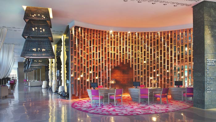 前臺的設計:當顧客進入空間之后,首先感受到的就是當?shù)氐娘L土人情,這也是設計師希望看到的場景,在設計師看來設計是要因地制宜的,在設計中設計師在當?shù)剡M行了多次的調研,目的就是要尋求當?shù)鼐哂写硇缘慕ㄖc文化,并將其縮小后融入空間之中。