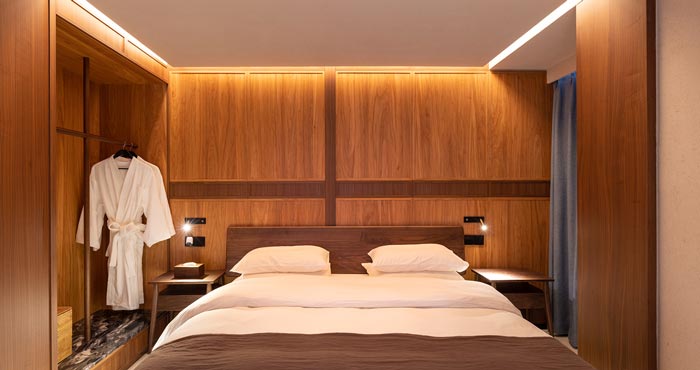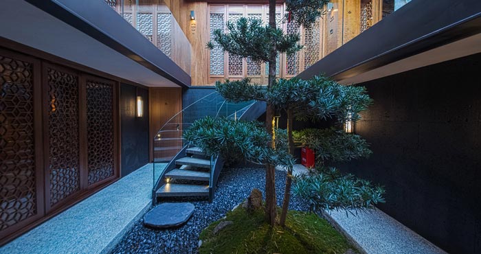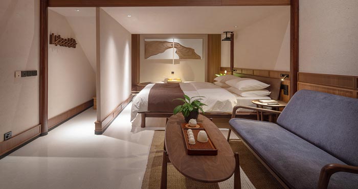 本次民宅民宿設(shè)計(jì)項(xiàng)目介紹結(jié)束,在設(shè)計(jì)中保留原建筑的柱網(wǎng)空間,同時(shí)以院落為中心,將空間劃分為四個(gè)客房區(qū)域,整體呈現(xiàn)中軸對(duì)稱的格局。