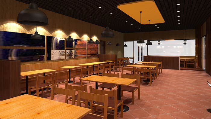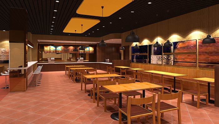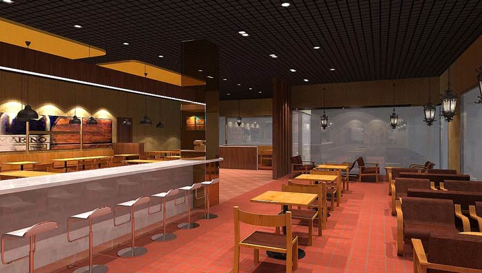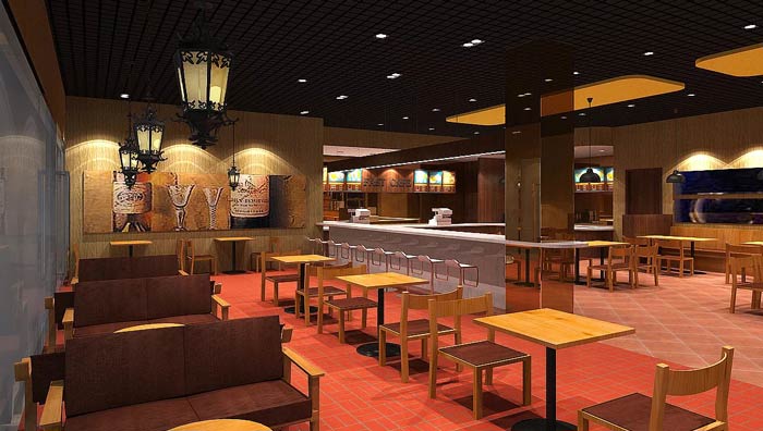 快餐店餐區(qū)裝修設(shè)計:暖色系的燈光、暖色系的色彩設(shè)計,給客戶一個穩(wěn)定的就餐環(huán)境,這里沒有用桔紅色,是希望給客戶一個安定的環(huán)境,業(yè)主不希望因為色彩的刺激,造成客戶吃快食。