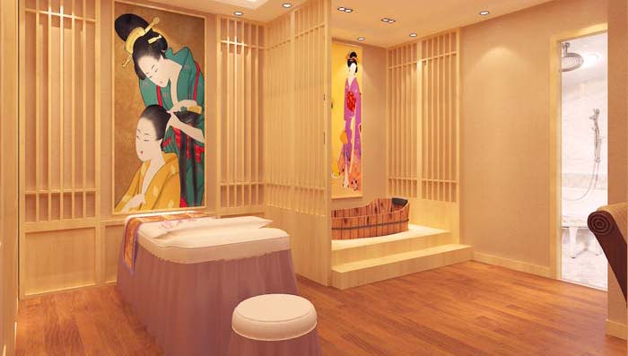 日式的SPA間,我們用了日式注明的細(xì)竹條做的花格,進(jìn)行紋樣的拼接,并且在花格上做了日式的浮世繪的刺繡。