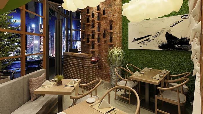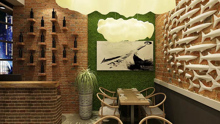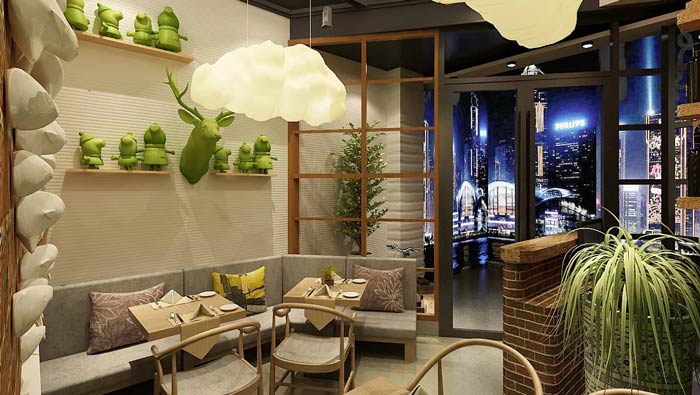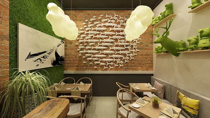 特色面館餐區(qū)裝修設計:這里有魚兒、鹿等動物,有綠植、綠色植物墻等植物,還有云狀的燈光,三者相連構成一個動靜結合的空間,在這里整個空間宛若自成一體。