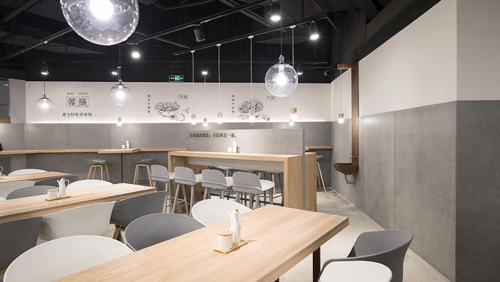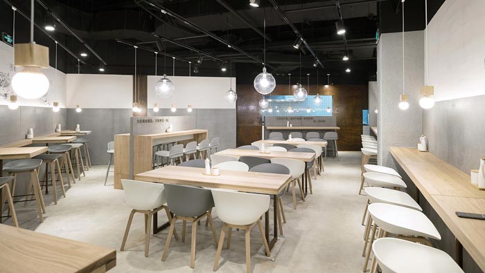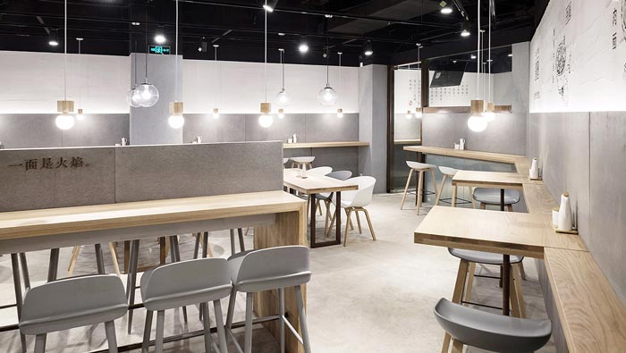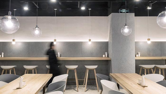 牛蛙面館餐位裝修設計:對著墻壁吃面不免局促孤單,而這正是店主與設計師想傳達的理念“專心吃好一碗面”,對著水泥墻面,吊著一盞溫暖小燈,將注意力集中在食物上。