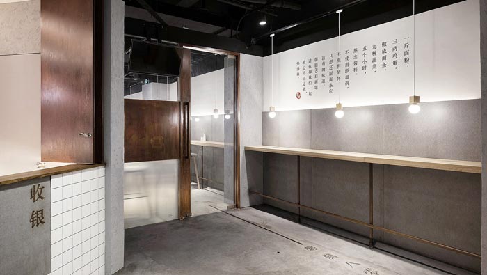 牛蛙面館裝飾設計:白墻膩子留下工匠手刷橫紋,這些細節(jié)對抗現(xiàn)代工業(yè)的批量生產,以原始的手工方式一遍一遍涂刷打磨,設計師意圖拋棄快餐式風格化的堆砌,還原室內空間的本質與真實。