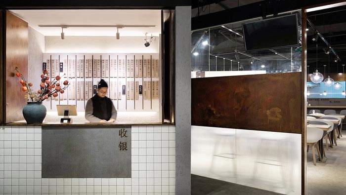 牛蛙面館入口裝修設計:設計師將面館入口處,布置成為收銀臺和等候區(qū),設計師為了保證空間的通透,與就餐不被打擾,故此采用三種不同透明度的材料,打造一個與眾不同的門。