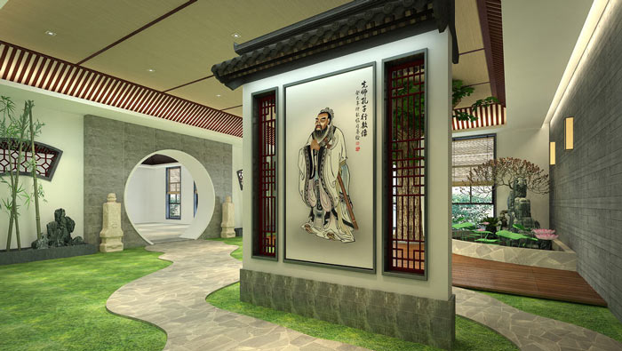 書法教育培訓(xùn)機(jī)構(gòu)庭院設(shè)計(jì):至圣先師的畫像佇立在庭院的正中央,為空間增添了莊重之感,自然的景色更顯書法的飄逸與自然。