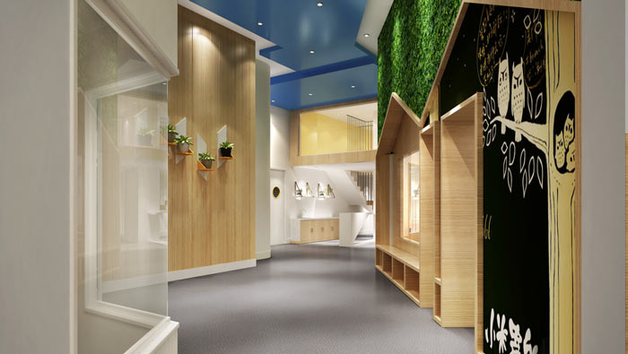 學(xué)前教育學(xué)校過道設(shè)計:灰色的地面、實木的隔墻、綠色的綠植過程了一個自然的空間,在這里孩子們感受到的不是壓力,而是快樂,成長的快樂。