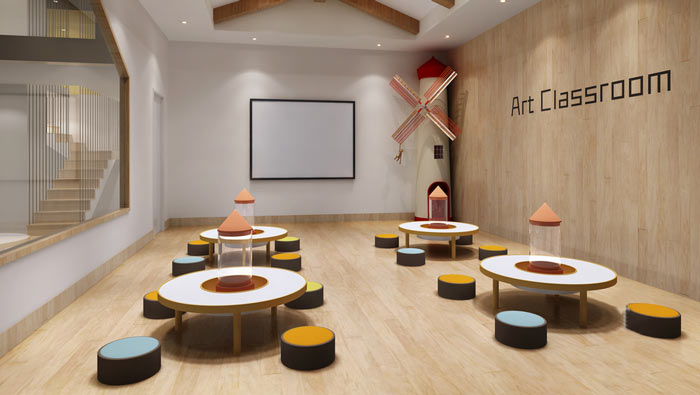 學(xué)前教育學(xué)校教室設(shè)計:孩子們圍著圓形的桌子,在這里聽老師講自己細(xì)化的事物,在不斷接觸新事物的同時,孩子們也在不斷的成長、脫變。