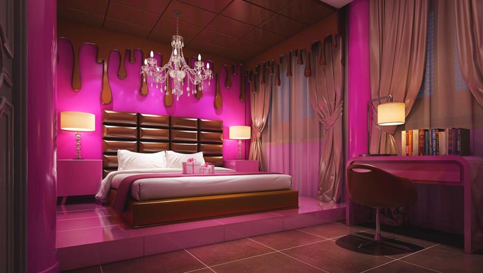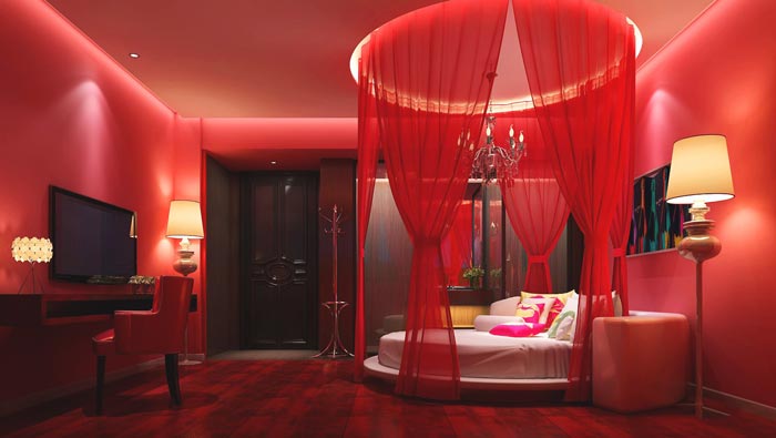 客房的設計:此處一看就是一處少女的閨房,在這里少女牽引著自己的戀人,一步一步的走進自己的閨房,代表著彼此都闖進了彼此的生活,在這里就是讓彼此更加珍惜自己,男孩子在女孩子的閨房之中需要山盟海誓,并以此為目標雙方一致在努力、奮斗,為了彼此美好的未來。