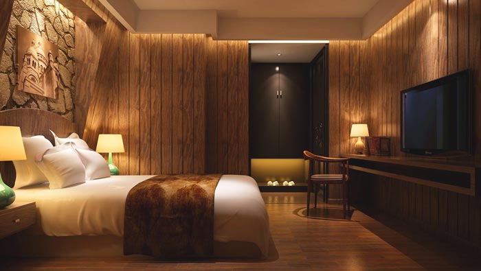 客房的設計:此次描繪的是日出而作、日落而息的場景,在這里讓戀人體會的是生活的艱辛,但在生活的艱辛之后感受到的是彼此之間的依賴,此處是希望戀人之間可以相互依存、相互幫助,不管遇到多大的困難,也要彼此共同面對,此處雙方的是勇氣,是勇敢面對困苦的勇氣。